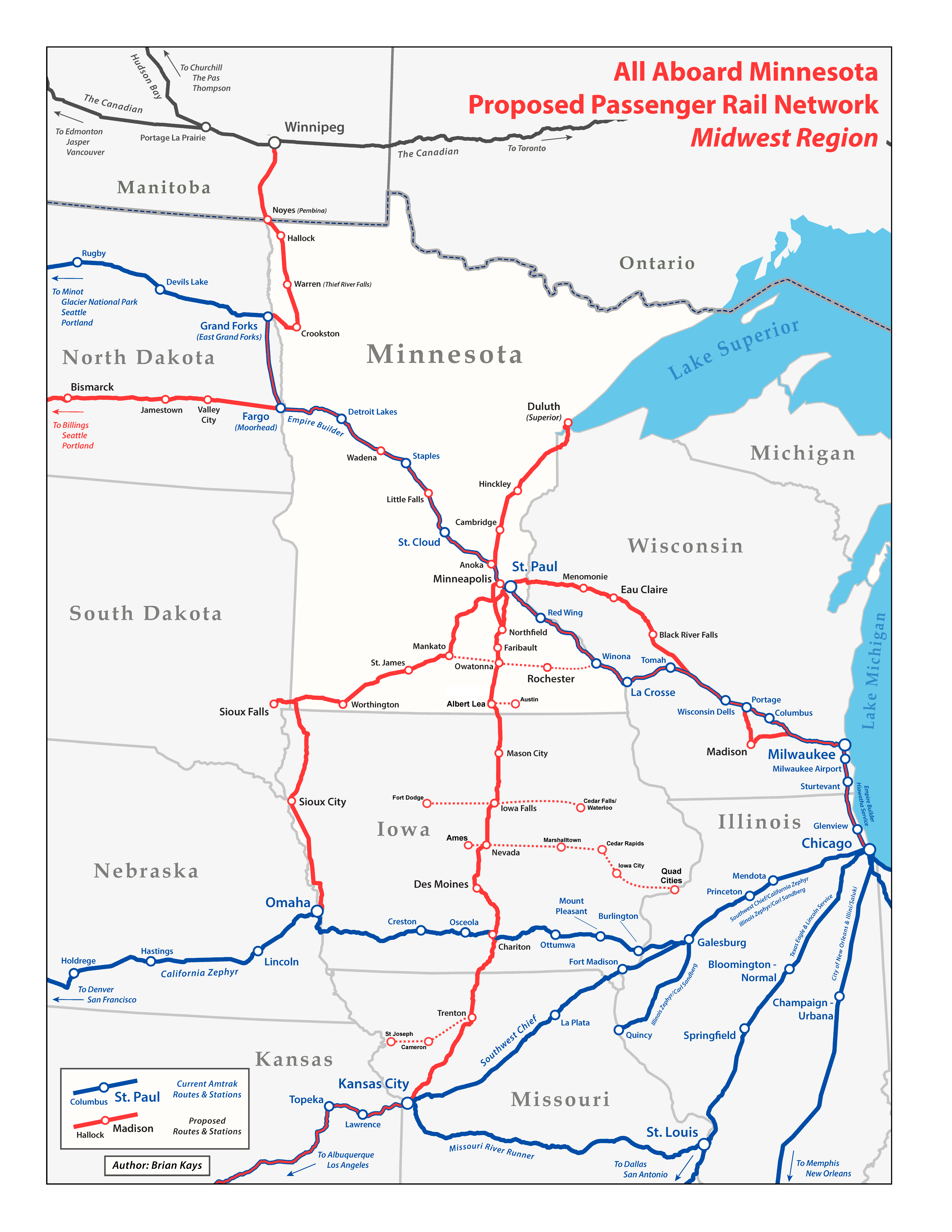 In order for new intercity train routes to function effectively, and to achieve true connectivity between routes emanating from the Twin Cities, it will be necessary to develop a dedicated passenger train route between the two downtown ‘anchor’ stations (St. Paul Union Depot and Target Field Station); a distance of 11 miles. All Aboard Minnesota believes (and as studies have shown) that train services work best – and are most cost-effective, convenient, and economically-viable—when they link together to create a interconnected ‘network.’ The more city pairs that can be connected, the more ridership each route will have. It is our opinion, based on our railroad industry experience, that failure to connect the two downtowns and offer true “on-train” connectivity would be a costly policy mistake that will serve to hamper ridership.
